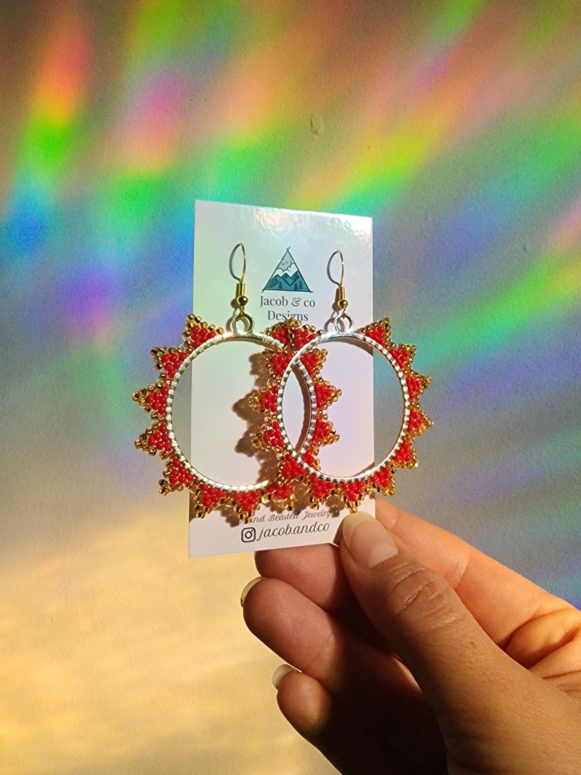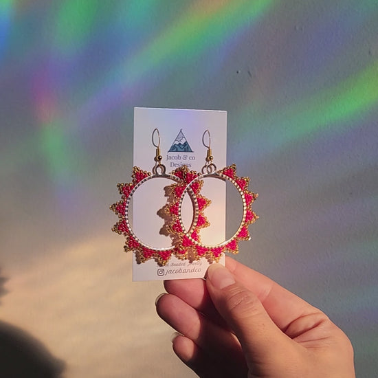 Czech seed beads around 1.5 inch hoops and 14k gold findings.