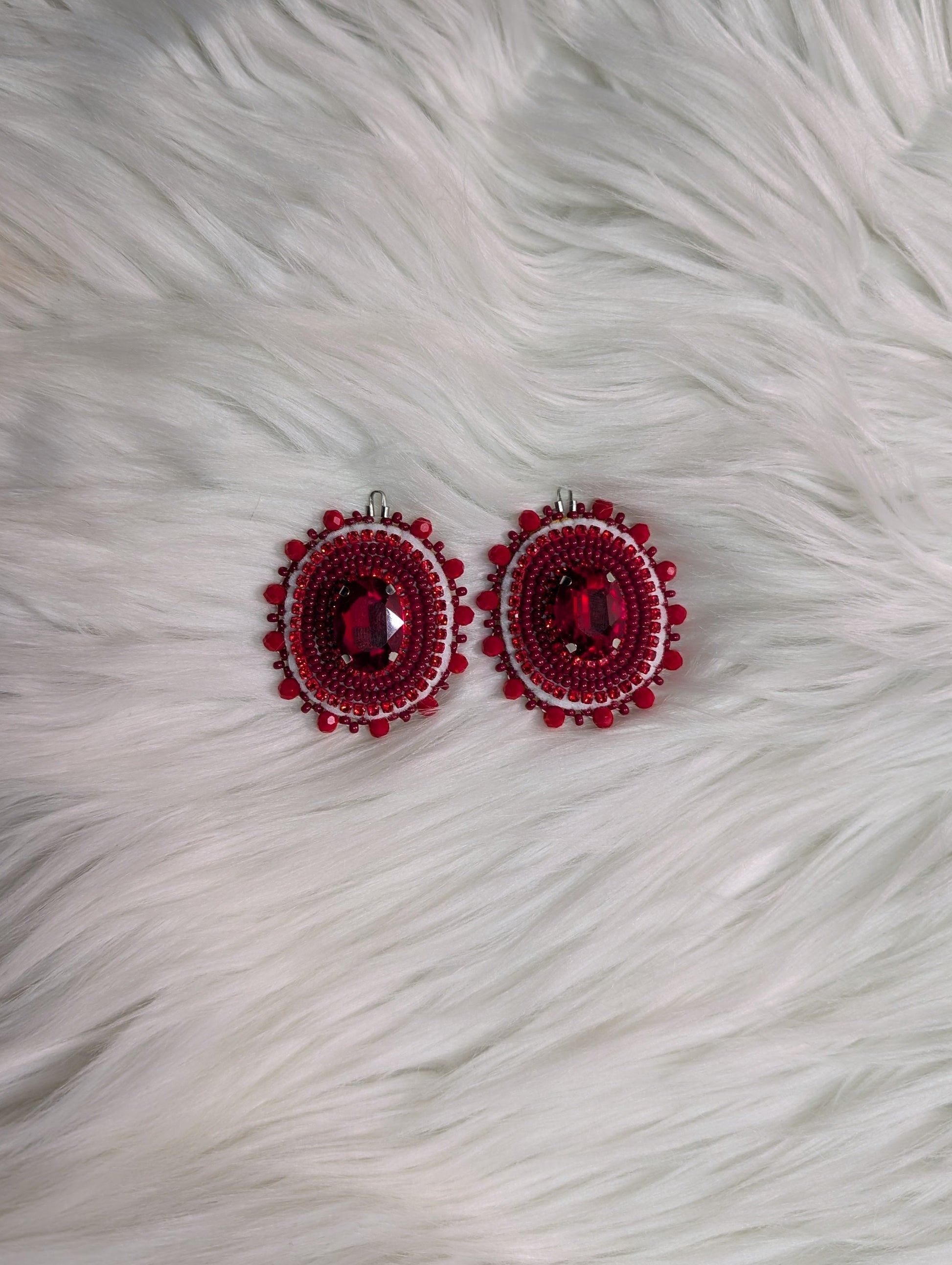 Made with Czech seed beads, rhinestone banding and deer hide backing. Finished with stainless steel hooks.